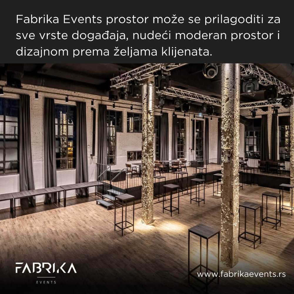 Fabrika Event Centar je prostor koji izaziva divljenje svojim industrijskim šarmom. Visoki plafoni, zidovi od golih cigli i železne grede ne samo da pripovedaju o industrijskoj prošlosti Beograda, već i postavljaju scenu za moderne predstave. Ali, Fabrika nije muzej, ona je živi prostor obogaćen najmodernijom tehnologijom.