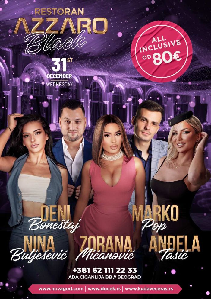 Za nezaboravan provod za doček 2026 pobrinuće se vrhunski izvođači: Zorana Mićanović, Deni Boneštaj, Anđela Tasić, Marko Pop i Nina Bulješević – garant za najluđu novogodišnju noć! Uživaćete u hitovima zabavne i narodne muzike, kako onih starih, proverenih izvođača, tako i onih koji su sada na sceni.